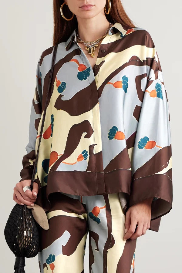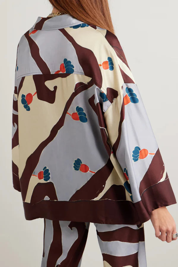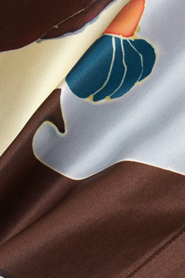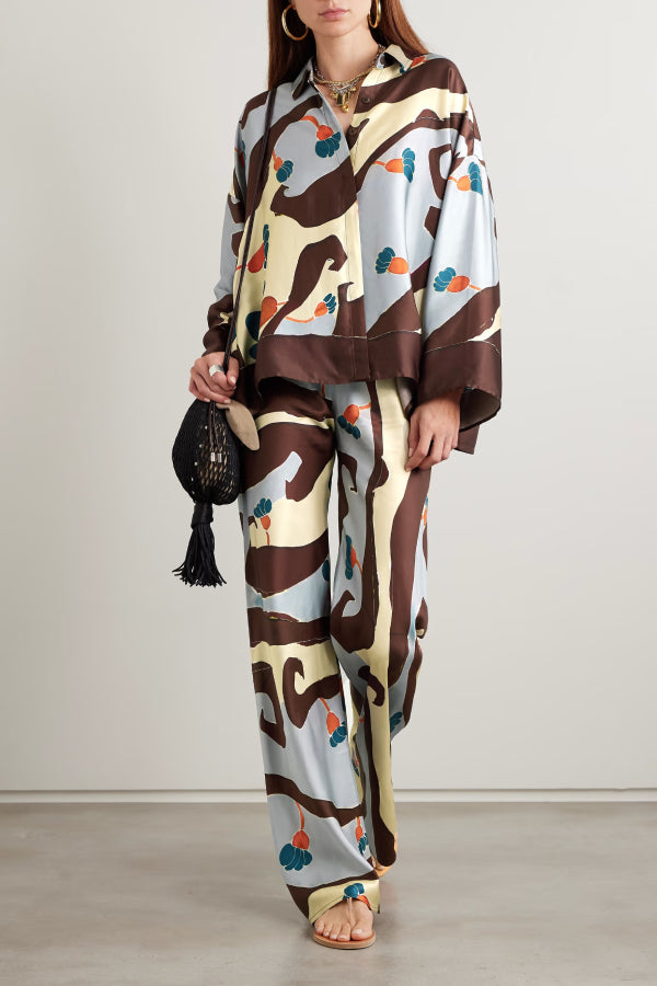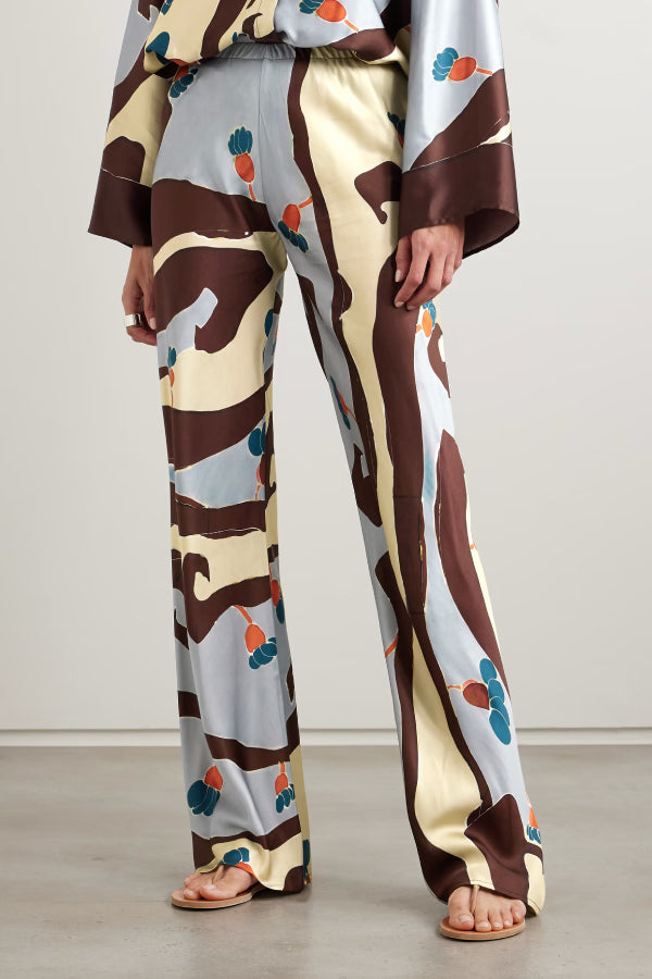 pants are printed with abstract artwork, featuring swirls of rich burgundy and budding florals. Made from fluid satin, they're cut wide and have a comfortable elasticated waist.